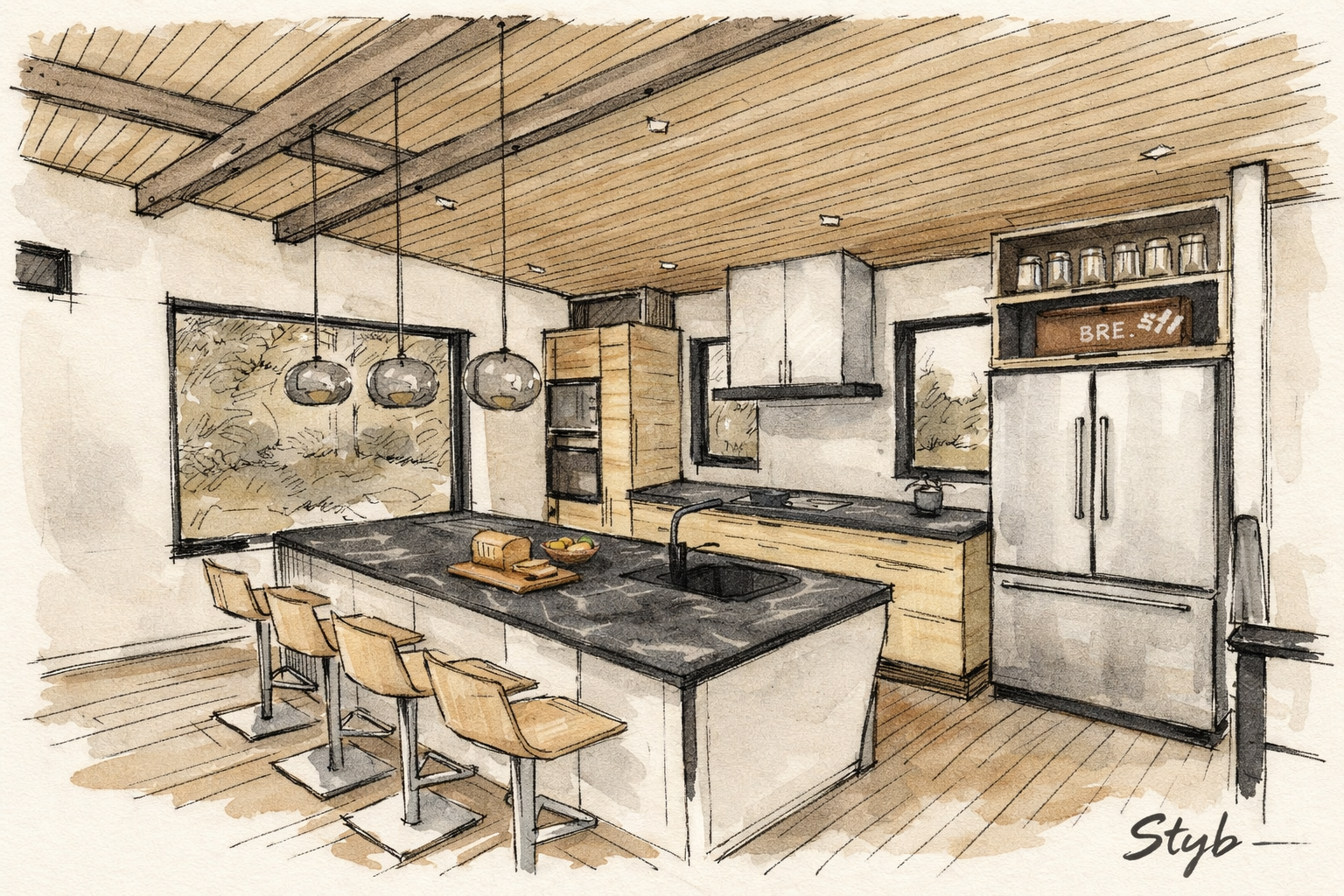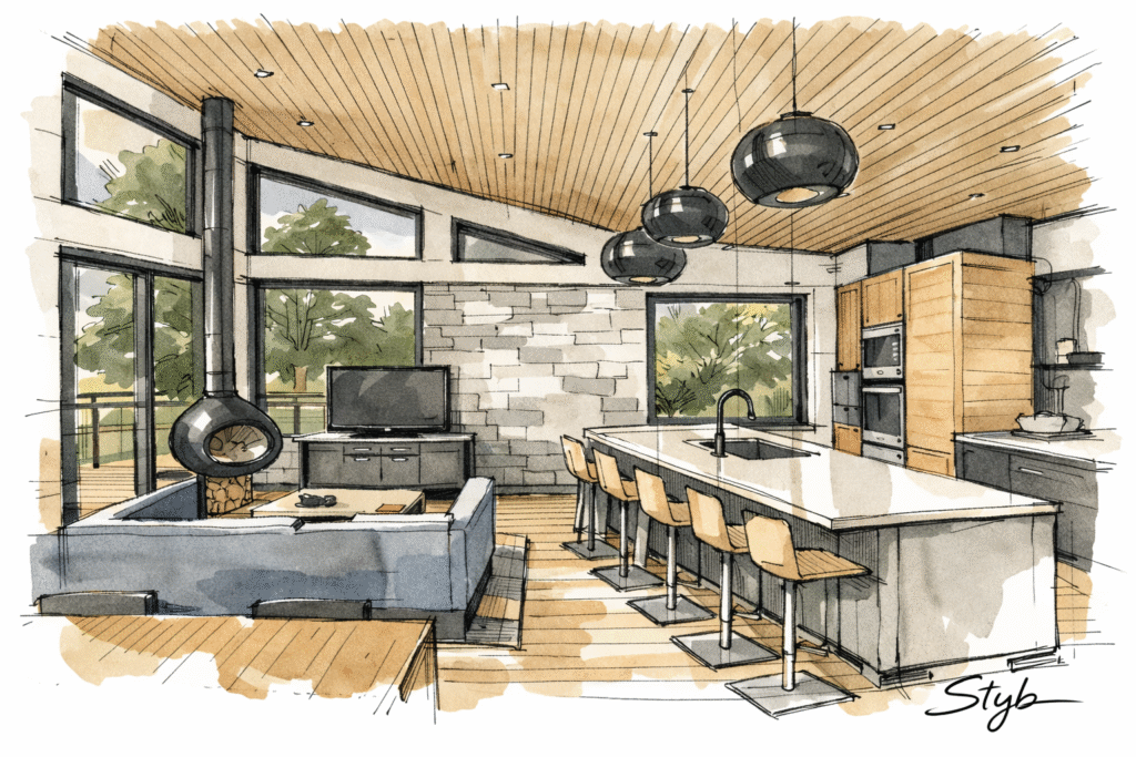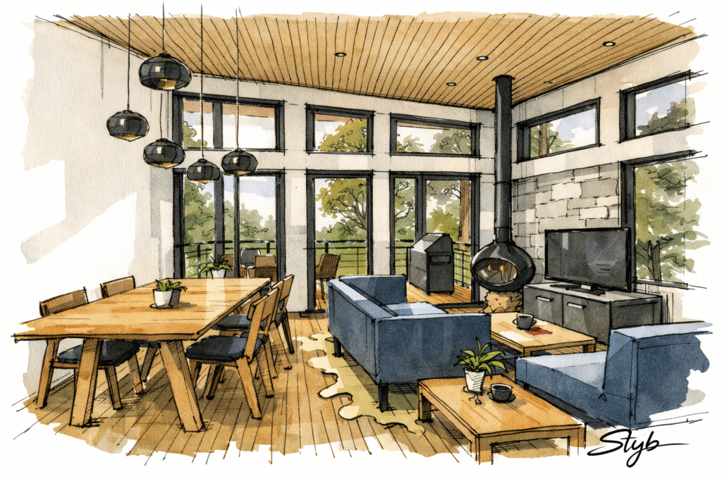 Le salon et la salle à diné sont situés dans un espace doté d’un toit cathédrale mono-pente pour laisser rentre un maximum de lumière. Les vues panoramiques offertes par le toit mono-pente de l’étage donne l’impression d’être un porche couvert. L’espace de vie est entouré de vitres et s’ouvre sur une grande terrasse.