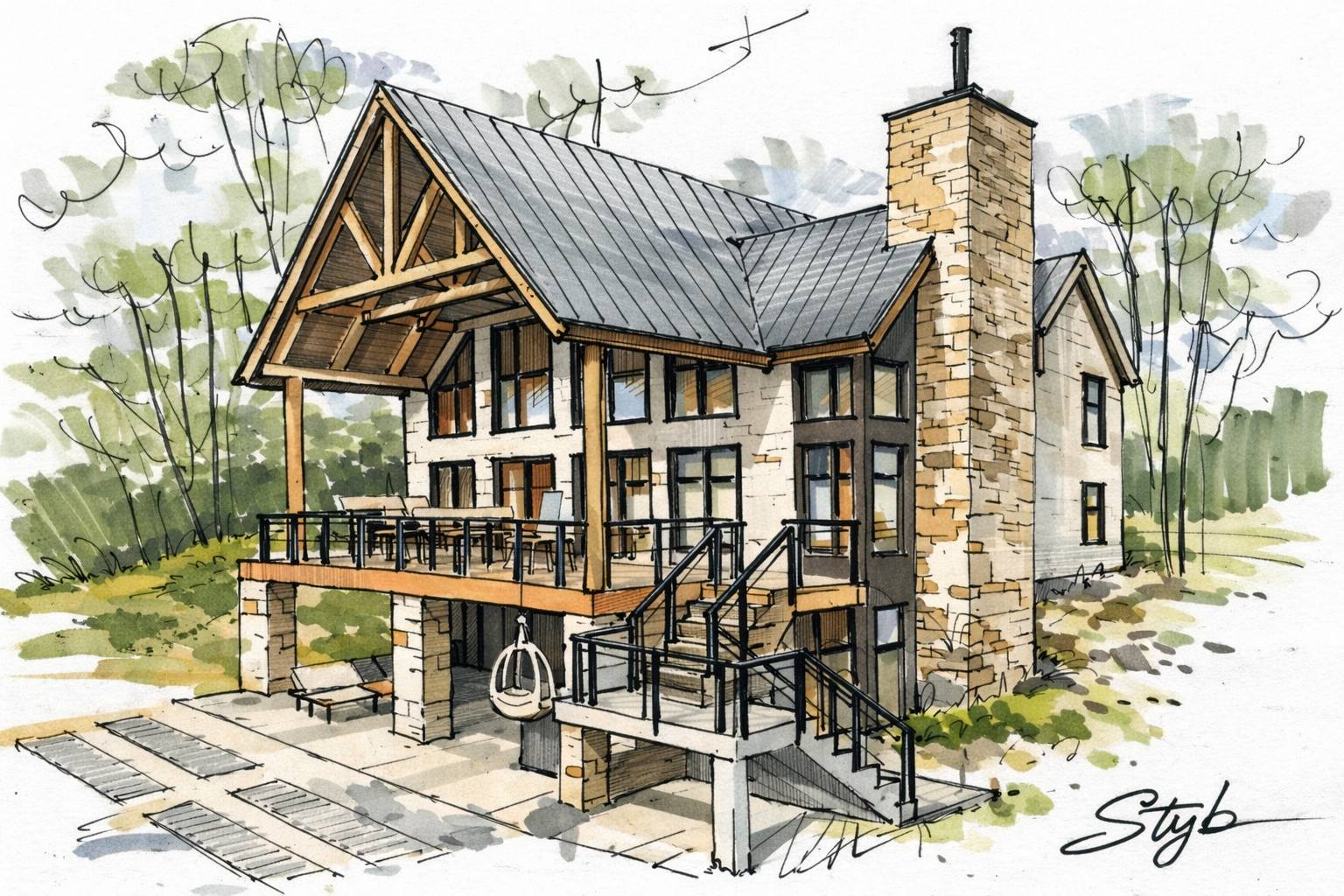 Idéal pour un terrain en pente vers l’arrière, ce plan de chalet de style style scandinave contemporain est parfait pour un emplacement au bord d’un lac ou en montagne, avec une conception entièrement orientée vers l’arrière pour maximiser les vues panoramiques et l’intégration avec la nature.