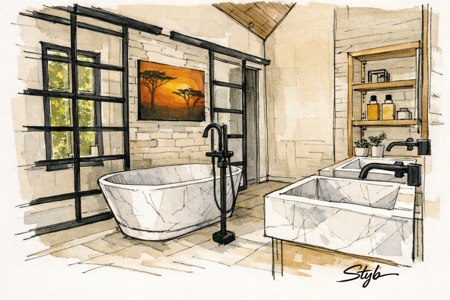 Le salon et la salle à manger sont réunis dans un espace avec un toit cathédrale en mono-pente, permettant à un maximum de lumière naturelle d’entrer. Les vues panoramiques offertes par ce toit donnent une impression de porche couvert. Cet espace de vie, entouré de grandes baies vitrées, s’ouvre directement sur une vaste terrasse, créant une continuité fluide entre l’intérieur et l’extérieur.
