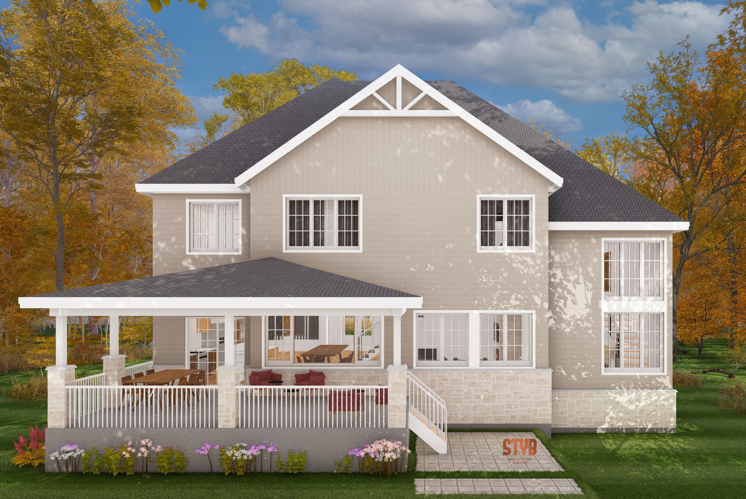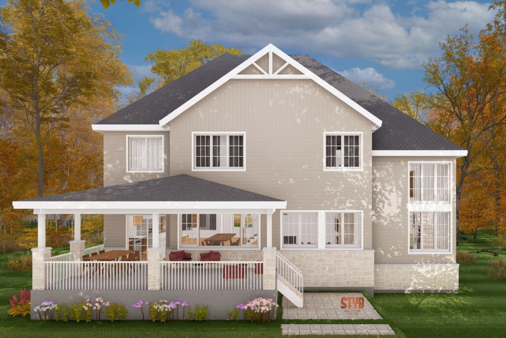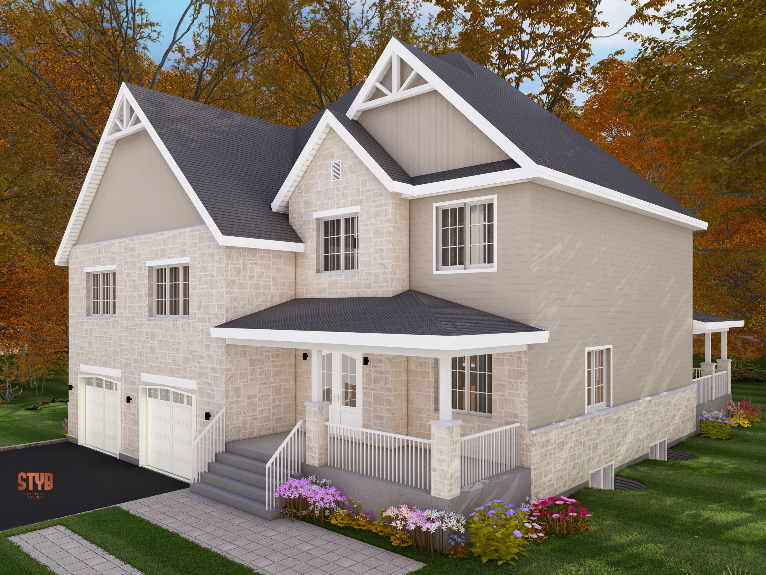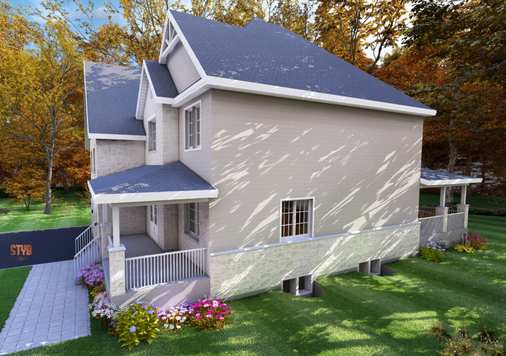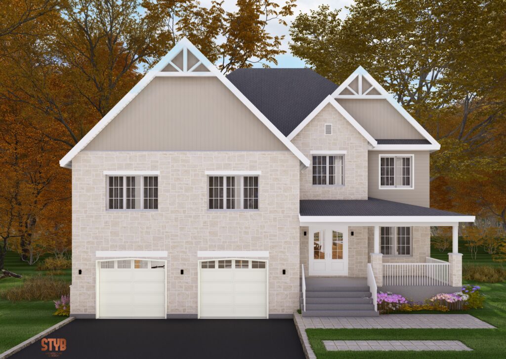 La conception met en valeur la lumière naturelle grâce à une fenestration abondante, tout en offrant des volumes équilibrés et des espaces intérieurs pensés pour le quotidien d’une grande famille. La combinaison de matériaux sobres et durables — pierre, vinyle de qualité et accents contemporains — assure une identité architecturale élégante et pérenne.